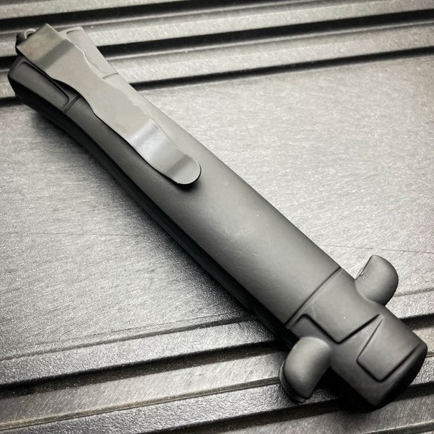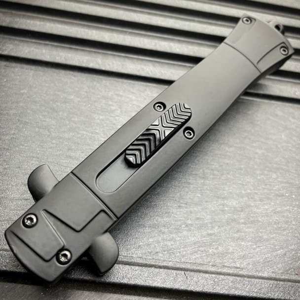 Dieses automatische Messer im italienischen Stil (9 Zoll OTF) verfügt über eine einseitig geätzte Bajonettklinge und einen Vollaluminiumgriff mit Gummibeschichtung.